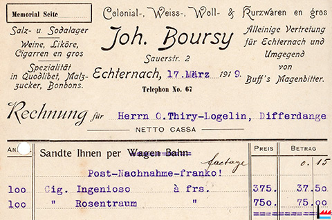 | <=1962 | Jean Boursy, succ. J. Kirschten & Ad. Schmit, denrées coloniales en gros Tél: 72067 |
