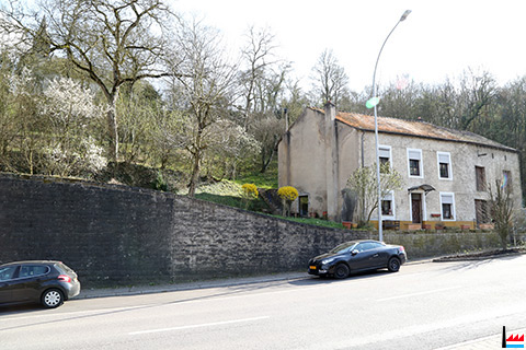 Links vom Haus befand sich früher eine Scheune (mit Stolleneingang zum Kalksteinbruch "im Kahlenberg"?), ganz links die früheren Eiskeller in Grevenmacher - oben im Hintergrund die Kreuzkapelle (Photo: