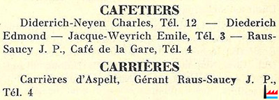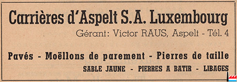 | <=1948/49 | Carrières d'Aspelt S.A. Gérant: Victor Raus - Flammang, Aspelt Pavés, Moëllons de pavement, pierres de taille sable jaune, pierre à bâtir, libages |