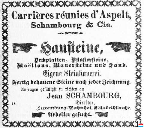 | 1900 | Carrières réunies d'Aspelt Jean Schambourg - Hédo, Direktor (+ 23.5.1919 Luxembourg, âge 49 ans) |