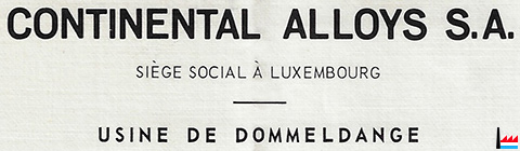 | Le 11 juillet 1969 la Continental Alloys S.A. a été créée par le groupe américain COC (Continental Ore Corporation) avec siège social à New York, et le groupe ARBED, avec siège social à Luxembourg, à raison de 50 % pour le groupe COC et de 50 % pour le groupe ARBED et ceci pour ARBED dans le cadre d'une diversification de sa palette de production. | |