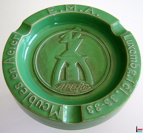 ![]() E.M.A. Meubles en Acier Luxembg. Tél. 35-33 Strafor Cendrier publicitaire (Collection : Philippe Aschman) Villeroy et Boch N° de forme: 1069 N° de décor: 547 Datation: années 1950 Diamètre: 14 cm Hauteur: 2,5 cm |
