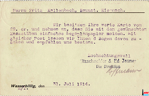 | 31.7.1914 | ![]() Utzschneider et Jaunez, Wasserbillig - Hoffmann (Collection: industrie.lu) an Baumaterialien Fritz Kallenbach, Eisenach / Thüringen |