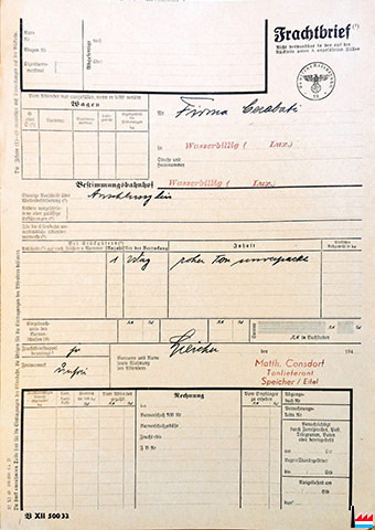 ![]() Frachtbrief - Wagenladung von Speicher nach Wasserbillig (Lux.) über Ehrang (Sammlung: Wilhelm Schommer) Empfänger: Cérabati, Wasserbillig (Lux.) Absender: Mathias Consdorf, Tonlieferant, Speicher (Eifel) Exploitation de terre plastique (argile) en tous genres - Terres réfractaires |