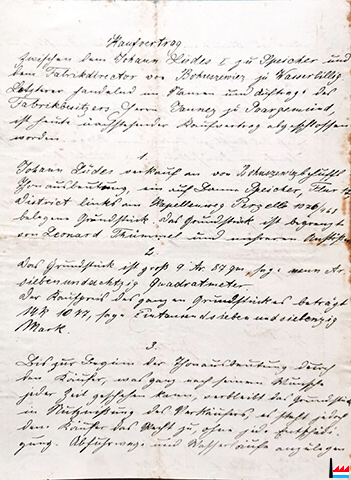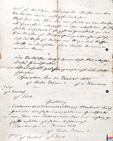 | 25.1.1883 | ![]() Kaufvertrag eines Grundstücks (9 Ar 87) auf Banne Speicher links am Kapellenweg - zwischen Johann Ludes, zu Speicher und dem Fabrikdirektor von Bohuszewicz zu Wasserbillig, handelnd im Namen und Auftrage des Fabrikbesitzers Herrn Jaunez, Saargemünd. Bis zur Beginn der Thonausbeutung durch den Käufer, was ganz nach seinem Wunsche jeder Zeit geschehen kann, verbleibt das Grundstück in Nutzniessung des Verkäufers, es steht jedoch dem Käufer das Recht zu, ohne jede Entschädigung, Abfuhrwege und Wasserläufe anzulegen ... Kaufpreis: 1.077 Mark ... gezeichnet u.a. Consdorf (Sammlung: Wilhelm Schommer) |