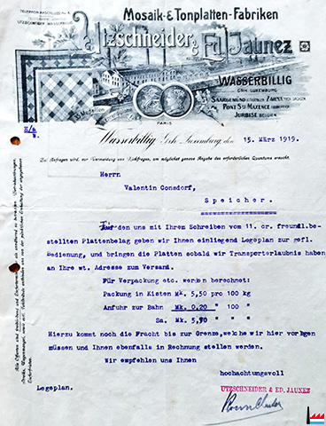 | 15.3.1919 | ![]() Schreiben von Otto Roever-Charton - Utzschneider & Ed. Jaunez, Wasserbillig an Valentin Consdorf, Speicher: Lageplan zu einem am 11.3.1919 bestellten Plattenbelag - 15.3.1919 (Sammlung: Wilhelm Schommer) |