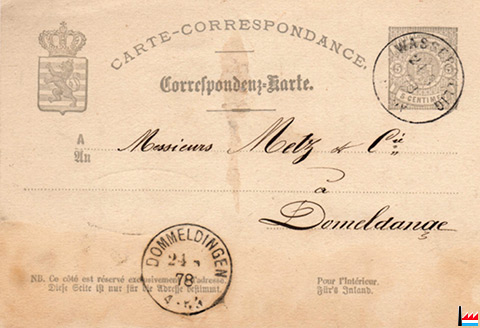 postale du 23.78.1878 de la Thonwaaren-Fabrik Utzscheider & Ed. Jaunez, Wasserbillig an Metz & Cie, Dommeldange (Collection: industrie.lu)