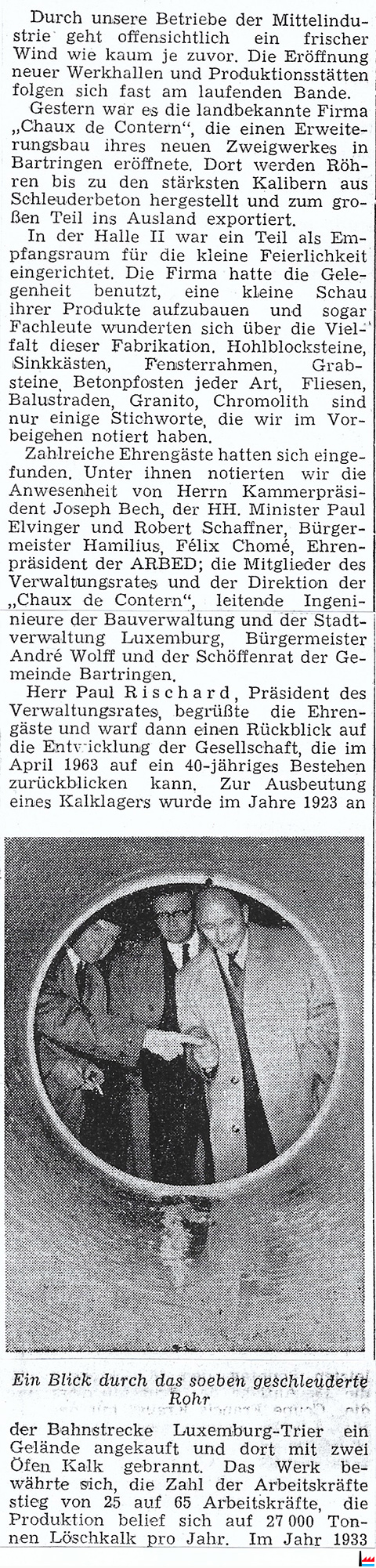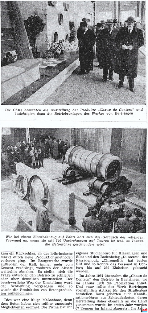 | 1960 | Arbeitsgemeinschaft zwischen Chaux de Contern und Züblin GmbH in Kehl / Rhein zum Bau der Fernwasserleitung vom Stausee in Esch/Sauer |