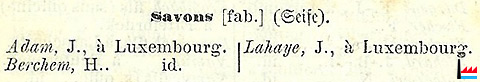 Fabriques de savons: Adam J., Berchem, H., Lahaye J. - 1857 (Source: Almanach du Commerce du Grand-Duché de Luxembourg par N.C., 1re année, 1857, Luxembourg, Heintzé Frères, Libraires-Éditeurs, page 40; Collection: famille Aschman-Bodson)