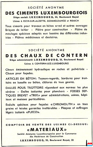 | Société Luxembourgeoise pour le commerce des Matériaux de construction Capital: 1.000.000 fr 22 Boulevard Royal, Luxembourg Usines à Esch/Alzette (marque Sanglier), Haren-lez-Bruxelles (marque Buda), Dommeldange, Rumelange, Péronnes (marque Fama), Allain |