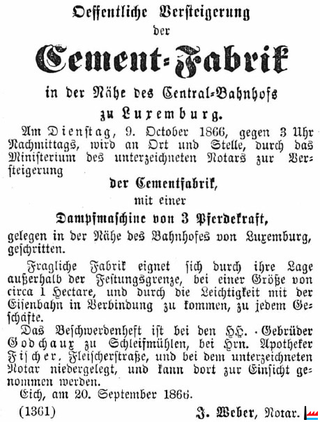 | 9.10.1866 | Adjudication publique de l'établissement pour la fabrication de schiste Öffentliche Versteigerung der Cement-Fabrik in