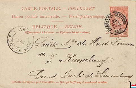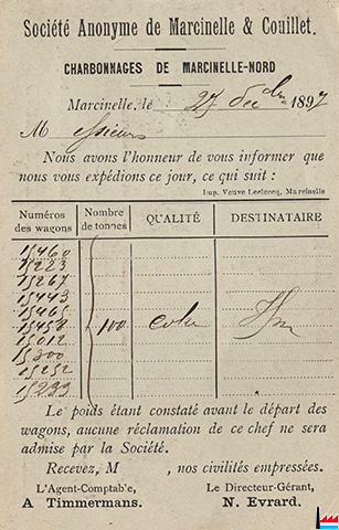 Carte postale de la Société Anonyme de Marcinelle & Couillet - Charbonnages de Marcinelle-Nord - 27.12.1897 - à la Société des Hauts Fourneaux de et à Rumelange (Collection: industrie.lu)