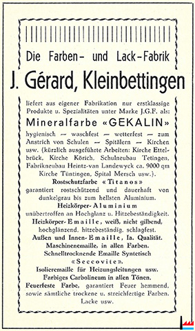 | <=1935 | FABRIQUE DE COULEURS Gerard-Kiewitsch J., fabr., de couleurs, Kleinbettingen, mastic pour vitriers, prod. spéc. Titanos, Tél. 11 | ||