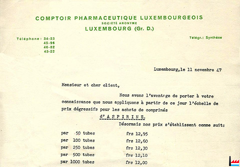 Comptoir Pharmaceutique Luxembourgeois - 11.11.1947 - papier à en-tête - Aspirine (Collection famille Aschman-Bodson, Luxembourg)
