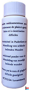 GRANU-CYSTEINE Usage externe - äußerlich - uitwendig - per uso esterno poudre médicamenteuse pour le traitement de plaies à granulation et à cicatrisation difficiles Arzneimittel in Puderform zur Behandlung von schlechtheilenden Wunden medicinaal poeder voor de behandeling van moeilijk heilende wonde farmaco per la cura di piaghe di difficile guarigione ACTESSA Luxembourg Flacon de poudre - Hauteur : 11,5 cm ; diamètre : 3,8 cm. (Collection famille Aschman-Bodson, Luxembourg) |