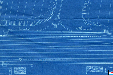Quai d'Huart, Pétange - vis-à-vis de la Halle aux marchandises et du premier Bâtiment des recettes - Plan: 1.5.1896 (Collection: Fernand Keiser)