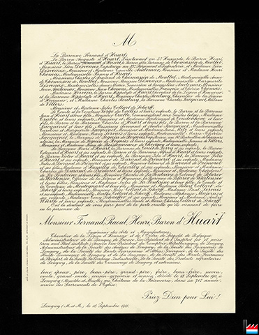 | 13.9.1911 | ![]() Faire part du décès de Fernand, Raoul, Henri, Baron d’Huart, ingénieur ECP à Longwy, au Château de la Faïencerie à l'âge de 70 ans (Collection industrie.lu) |