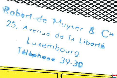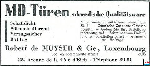 | Avril 1947 | 39 30 de Muyser, Robert & Cie, importation, représentation, exportation, Côte d’Eich, 25. Indicateur officiel des téléphones - avril 1947 - Imprimerie St. Paul. Luxembourg (Collection Philippe Aschman). |