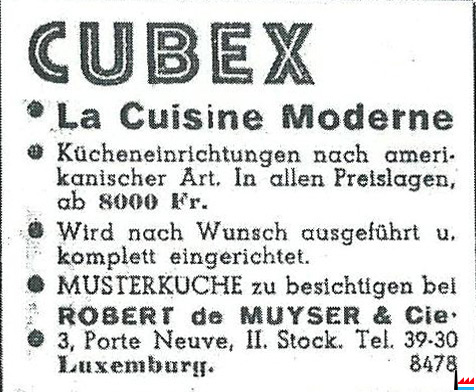 CUBEX - La Cuisine Moderne - Robert de MUYSER & Cie. - 3, Porte Neuve, II. Stock. Tel. 39-30 Luxemburg - 11.12.1948