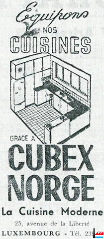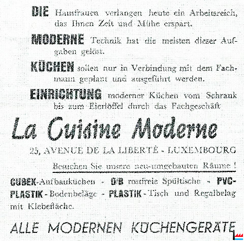 | 1957 | Küchen-Traumland Die Luxemburger Hausfrau, welche in der beneidenswerten Lage ist, „ihre" Küche einrichten zu können, wird in dem Fachgeschäft „La Cuisine Moderne" 25, Avenue de la Liberté, die Erfüllung ihrer Träume finden. In diesen Tagen wurde das schon seit Jahren bestbekannte Geschäft renoviert und schon von der Straße aus ist festzustellen, daß die Anstrengungen der Besitzer erfolgreich waren: durch eine kluge Disposition konnte Raum gewonnen werden und es ist eine wahre Freude für das Auge, die verschiedensten „Küchenherrlichkeiten" zu bewundern. Die Geschäftsinhaber (Robert de MUYSER et Co.) verfolgen die moderne Richtung, welche den Plastikmaterialien in der neuzeitlichen Küche viel Raum gewähren will. Von den kleinsten Küchenutensilien bis zu den gepflegten PVC-Fußböden reicht die Skala der Verwendungsmöglichkeiten dieses Stoffes, und man macht uns mit Recht auf die Tatsache aufmerksam, daß Plastikküchenartikel immer sauber und hygienisch sind, bei annehmbaren Preisen. „La Cuisine Moderne" führt neben allen einschlägigen Haushaltsapparaten (unter denen der Rotor-Mixer eine wichtige Stellung einnimmt) auch die praktischen und beliebten Cubex-Küchen, welche in Standardausführungen geliefert werden, doch sind Anpassungen an gegebene Raumverhältnisse ohne weiteres denkbar (kostenloser Preisanschlag auf Verlangen durch die Firma); in einem schönen Ausstellungsraum kann die Gesamtwirkung dieser Anbauküchen jederzeit von Interessenten „studiert" werden. Wir bezweifeln nicht, daß die Renovierung des beliebten Fachgeschäftes „La Cuisine Moderne" den Geschäftsinhabern das Interesse der Luxemburger Hausfrauen und aller Baulustigen gewinnen wird. (d’Lëtzebuerger Land - 22.2.1957) |