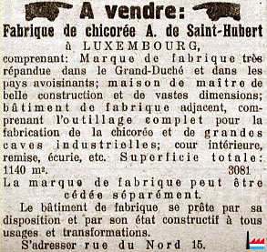 | 1919/1920 | ![]() A vendre: Fabrique de chicorée A. de Saint-Hubert à LUXEMBOURG . comprenant: Marque de fabrique très répandue dans le Grand-Duché et dans les pays avoisinants; maison de maître de belle construction et de vastes dimensions; bâtiment de fabrique adjacent, comprenant l'outillage complet pour la fabrication de la chicorée et de grandes caves industrielles; cour intérieure, remise, écurie, etc. Superficie totale : 1140 m² La marque de fabrique peut être cédée séparément. Le bâtiment de fabrique se prête par sa disposition et par son état constructif à tous usages et transformations. S'adresser rue du Nord 15 (Source: Tageblatt) |