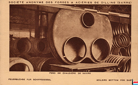 Dillinger Hütte - Société anonyme des forges et aciéries de Dilling (Sarre) - Fond de chaudière de navière - Feuerbüchse für Schiffskessel - Boilers bottom for ship (Carte postale: Collection: industrie.lu)