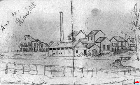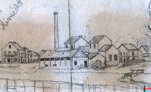 Ancienne fabrique de Roodt s/Syre - vers 1889 - Croquis (8 x 13,5 cm) réalisé par Raymond de Muyser (Collection de Muyser-Huck)