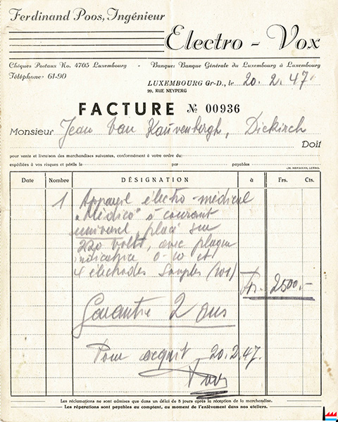 ![]() Ferdinand Poos, ingénieur - Electro-Vox, 20 rue Neyperg, Luxembourg - Facture de 1947 (Collection: industrie.lu) |