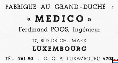 | >=1962 | Ferdinand Poos, Ingénieur E.I.L. fabrique des appareils électro-thérapeutiques Medico 17, Bld Dr Charles Marx, Luxembourg |