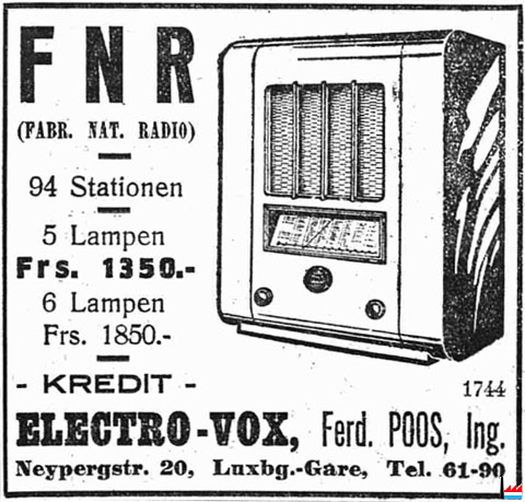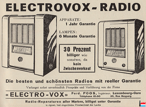 | 9.1935 | Ingenieur F. Poos - Stand 29 auf der VI. internationalen Radio-Ausstellung im Volkshaus in Luxemburg Radio-Empfänger Electro-Vox, mit europäischen Lampen und stiftlosem Sockel equipiert, Schattenanzeiger mit neuester Skala und der rezenten Wellenverteilung. Die Skala zeigt 90 Stationennamen auf. Elektrischer Heilapparat 600 Fr |