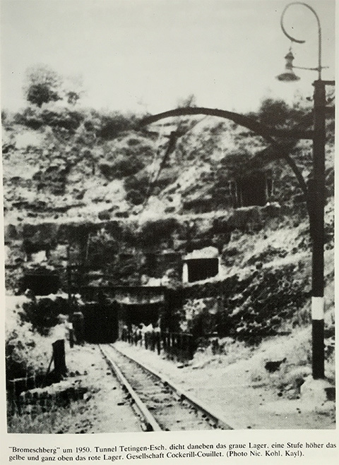 Där frot hei wou des Minière ass. Hei schecken ech iech Fotoen an och een Text aus dem Buch „ Tetingen Rote Erde,Rundes Leder „. Op der Foto op der Säit 319 gesäit een des Galerien déi um Bromeschbierg sinn. Aus dem selweschten Buch och een Text Säit 308 an 309 iwwer den Bromeschbierg an den Holleschbierg. Aus dem Buch „ Bergbau im Luxemburger Minetterevier do sinn 2 Fotoen vun déier selweschter Plaaz ze gesinn. Hei schreift den Auteur et wier um Holleschbierg. Déi 2 Sachen kenne stemmen. Um Bromeschbierg ginn dess Galerien erann, sinn awer an Concessioun Holleschbierg gaangen. Um Concessioun’s Plang fend een nach den Numm vun dem Dagebau „ Anc. Minière Hainaut“. Mär sinn also hei zu Teiteng an der Gemeng Kayl.