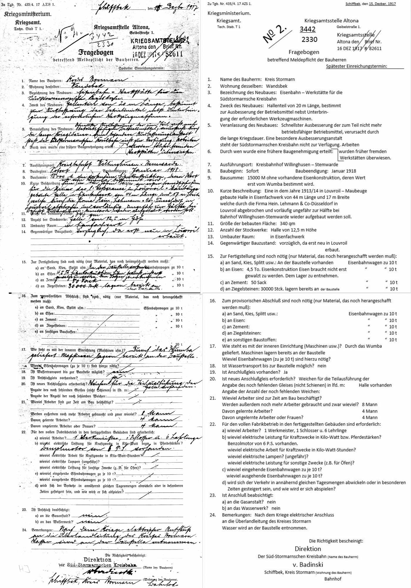 Dabei handelt es sich um den Fragebogen den der Bauherr seinerzeit auszufüllen hatte. Ich habe den ausgefüllten Bogen transkribiert und dem Original angefügt. In dem angehängtem Bild sind beide Exemplare zu sehen. Demnach wurde die Halle 1913/1914 in Louvroil-Maubeuge gebaut. Durch die Firma Hein. Lehmann & Co. abgebrochen und in Willinghusen-Stemwarde wieder aufgebaut. Die Einzelheiten entnehmt ihr bitte den angefügtem Bild. Bereits am 22. Dezember 1917 wurde der Bau genehmigt.