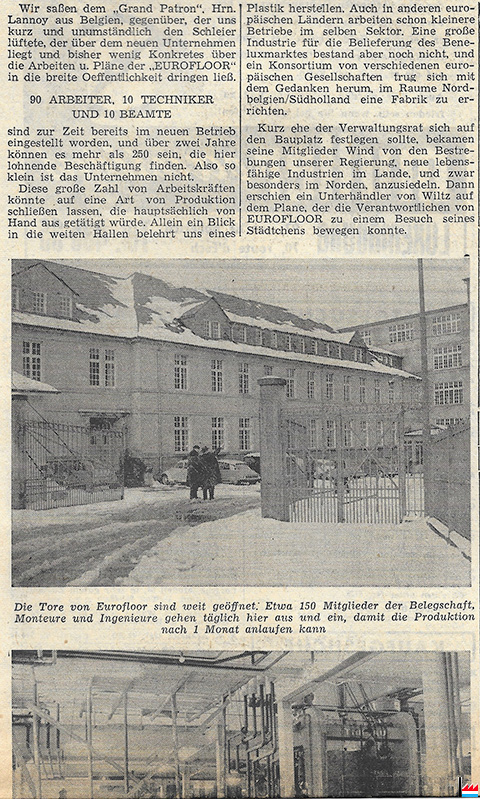 ![]() ![]() ![]() ![]() Die junge Eurofloor macht ihre ersten Gehversuche - Ein Besuch in der neuen Plastikfabrik zu Wiltz (LW: 22.2.1962 p.11; scan: Fernand Toussaint) ![]() Der Verladekran hinter dem Ideal-Gebäude hat in den letzten Monaten zahlreiche schwere Maschinen von den Fernlastern gehoben. Jetzt drehen sich bereits die Walzen und Räder im Innern der Hallen, und die Rauchfahnen auf den Schloten sind den Wilzern ein Symbol des Aufblühens ihrer Industrie, (LW: 22.2.1962 p.11; scan: Fernand Toussaint) |