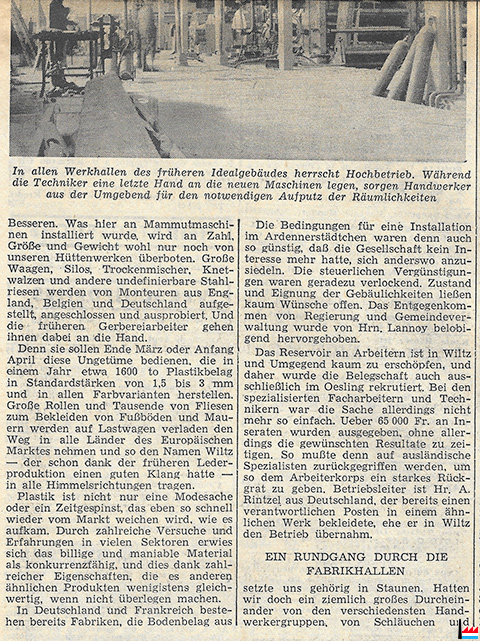 | 9.1961 | ![]() Industrieller Aufbau in Wiltz (frühere Ideal-Gerberei) - Eurofloor - Circuit Foil - Manuwil - Peausserie Ardennaise (LW: 11.9.1961 p. 9; scan: Fernand Toussaint) |