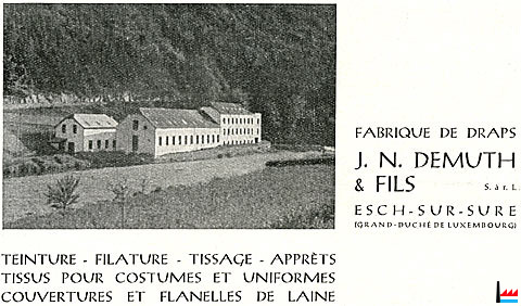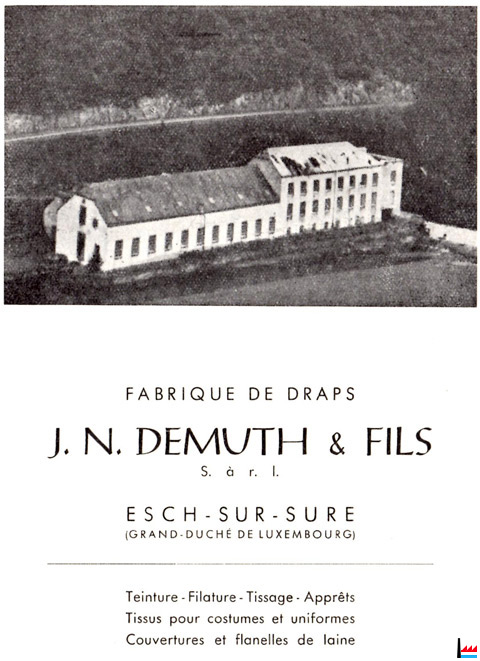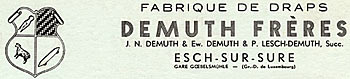 | 1.1.1935 | Fondation: Fabrique de draps DEMUTH FRERES & Fils par Jean-Nicolas Demuth, Ewald Demuth - Greisch (fils de Jean-Nicolas Demuth), et Paul Lesch - Demuth (gendre de Jean-Nicolas Demuth) Capital: 400.000 francs |