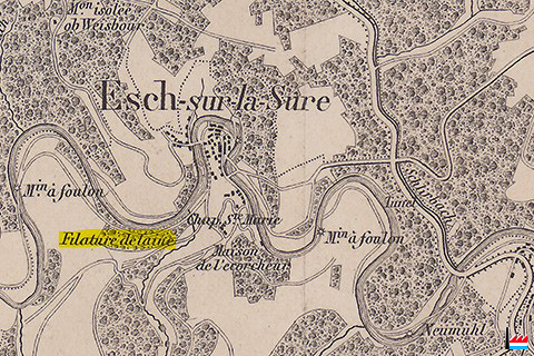 | 1862 | ![]() Esch/Sûre: Moulin à foulon (Oberste) - Filature de laine - Moulin à foulon (Unterste) - Tunnel - Neumuhl (Carte Jean-Baptiste Liesch - 1862) |