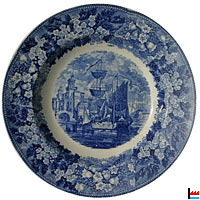 Faïencerie J. Lamort, Echternach: Porcelaine opaque Lamort Echternach Assiette creuse avec décor imprimé bleu de bouquets fleuris sur l'aile tandis que le médaillon central représente des voiliers en rade de Venise Diamètre: 24 cm |