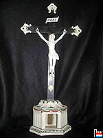Kräiz wat beim Lamort zu Iechternach gemeet gouf. Et kënnt aus ménger Famill. Den Här Frank Wilhelm méngt et wir dat eenzegt mat dem Sockel wat nach intakt ass. De Sammler Wagner vun Iechternach huet jhust zwee Sockelen. Si hun allen drei een aneren Dekor. Mein Exemplar as vum Lamort séngem Faïencier signéiert. (Collection: Jo Kohn) |