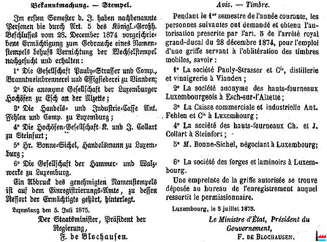 | 26.9.1874 | Antoine Fehlen, banquier, demeurant à Luxembourg, détenteur de 10 actions de la S.A. Sucrière du Luxembourg,
