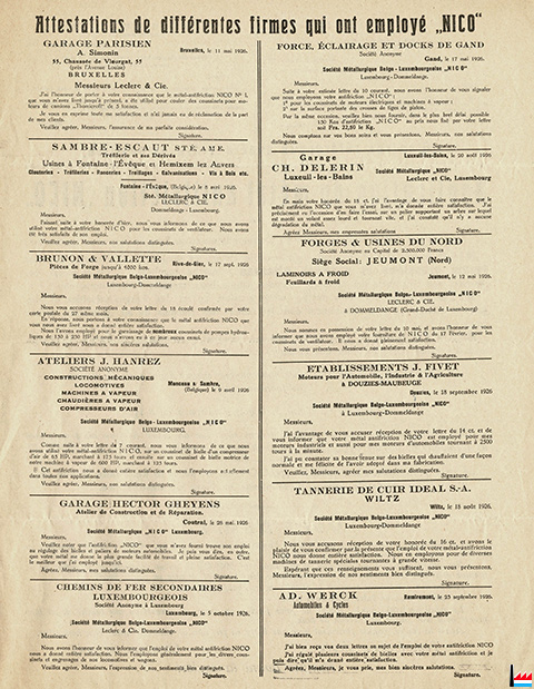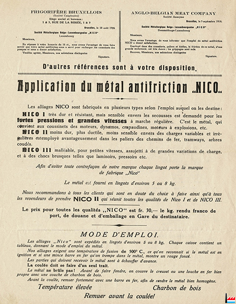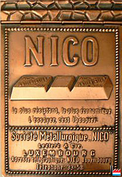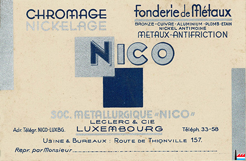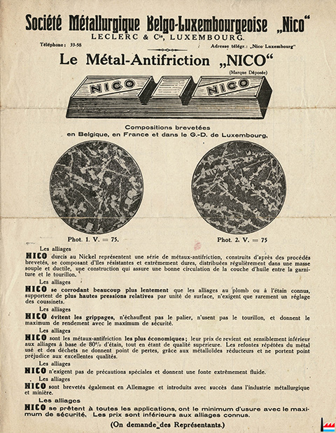 | 1926 | ![]() Société Métallurgique Belgo-Luxembourgeoise Nico (Collection: industrie.lu) Leclerc & Cie, Luxembourg Métal-antifriction Nico, compostions brevetées en Belgique, en France et au G.-D. de Luxembourg |