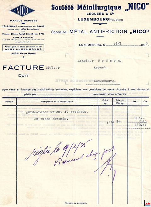 Spécialité : MÉTAL ANTIFRICTION « NICO » Téléphone Luxembourg N° 33-58 Papier à lettre à en-tête (Collection Aschman-Bodson) Facture 25/1679 du 31.1.1935 adressée à Monsieur Bodson, avocat. |