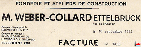 Fonderie et Ateliers de construction M. Weber - Collard, Ettelbruck - Facture du 18.9.1952 (Collection: industrie.lu)