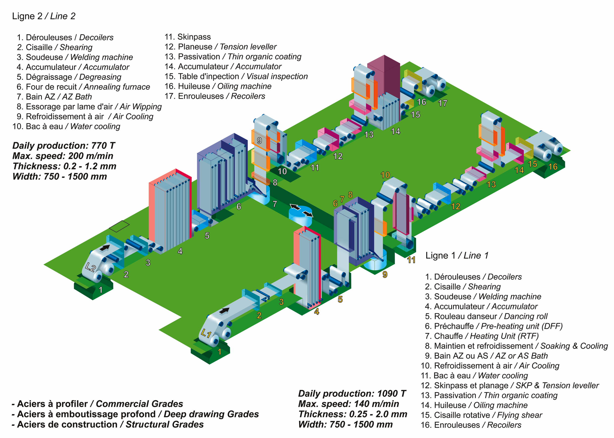 | 1991 | Mise en service d'une deuxième ligne spécifiquement pour des tôles de fines épaisseurs et exclusivement en revêtement ALUZINC ALUZINC est fait en fusion d'aluminium (55%), de zinc (43,4%), et d'une touche de Silicium (1,6%) |