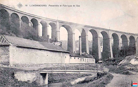 | <=1934 | ![]() Gazomètre de l'ancienne fabrique de gaz, Pétrusse + Passerelle (pont), Luxembourg - <=1934 (Carte postale: Edition W. Capus, Luxembourg N° 23; Collection: industrie.lu) |