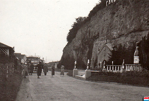 Foto déi um Site vun Caves St. Martin gemaach gouf (Richtung Remich) am Hannergrond eppes gesinn wat en Gasometer vum Gaswierk vun Réimech kéint sinn. D’Gebai vum eemolegen Gaswierk grenzt jo direkt un d’Caves St. Martin. (Photo collection: André Bremer)