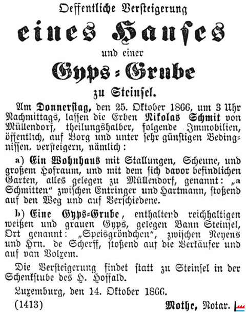 | Steinsel | Speisgröndchen / Spéisgrëndchen | 1866 | Nicolas Schmit | Gyps-Grube, enthaltend reichhaltigen weissen und grauen Gyps | ||