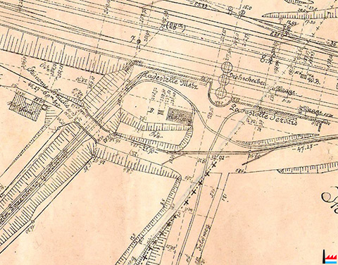Aussenbahnhof Esch: Links die die Ladestelle (Quai) und Seilbetrieb (Schiefe Ebene / Plan incliné - Privateigentum der Wilhelm Luxemburg Gesellschaft ) der Grube Lallingerberg von Metz & Cie, rechts die Ladestelle (Quai) und Seilebene (Plan incliné) der Grube Lallingerberg der Servais & Cie - 3 Drehscheiben + 2 Waagen (Plan: um 1890 Marcel Schlim)