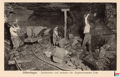 Differdingen - Zerkleinern und verladen der abgeschossenen Erze (Carte postale: Verlag Ch. Grieser, Hofphotograph, Luxemburg, 1916; collection: industrie.lu)