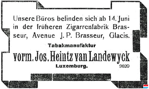 | 14.6.1918 | Unsere Büros befinden sich ab 14. Juni 1918 in der früheren Zigarrenfabrik Brasseur, avenue J.P. Brasseur, Glacis Tabakmanufaktur vormals Jos. Heintz van Landevyck Luxemburg (LW: 14.6.1918.) |