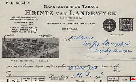 de tabacs Heintz Van Landewyck à Luxembourg - Extrait d'une facture de 1936